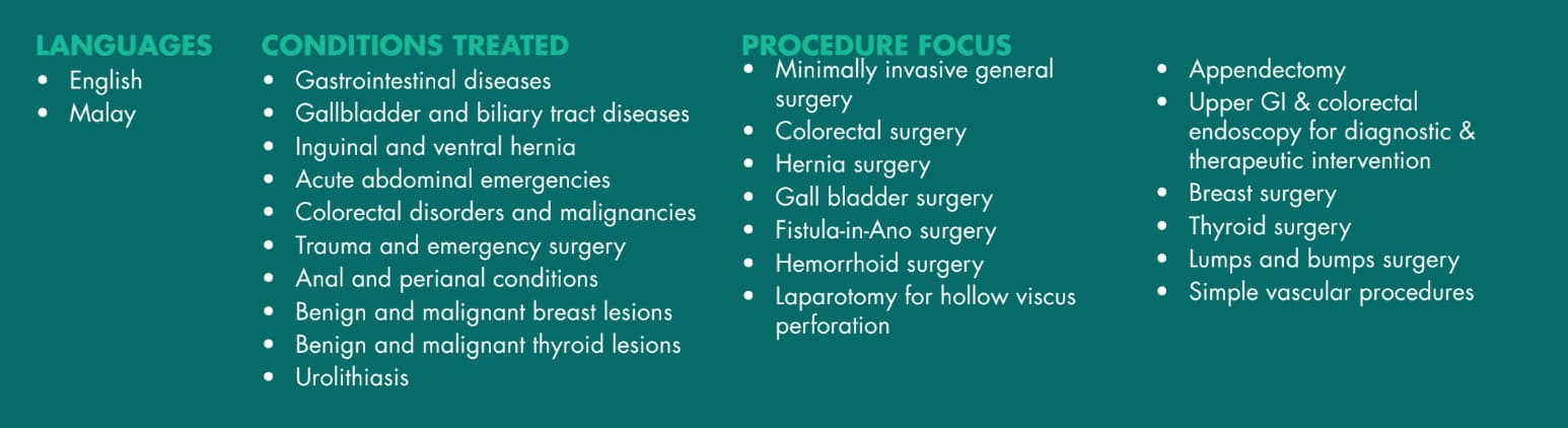 Dr. Alif is fully registered under the National Specialist Register (NSR) for General Surgery and is actively involved in national-level research, audits, and collaborative studies. Throughout his career as a general surgeon, he has served in various clinical and leadership roles at major government hospitals including Hospital Melaka, Hospital Jasin, Hospital Tuanku Ampuan Najihah and Hospital Tuanku Ja’afar Seremban.