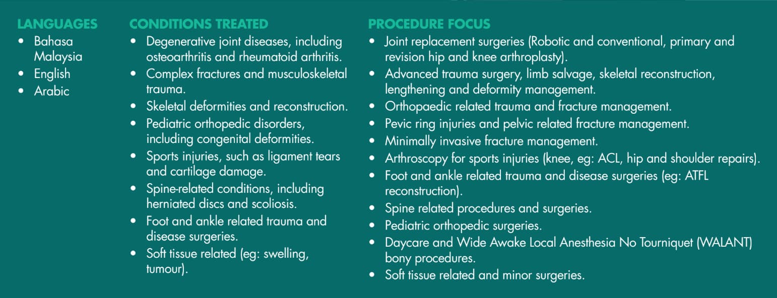 Dr. Muhamad Fitri ialah seorang Pakar Bedah Ortopedik dan Traumatologi yang berdedikasi dengan kepakaran dalam bidang artroplasti, dengan tumpuan utama pada artroplasti robotik dan trauma muskuloskeletal maju. Beliau memperoleh ijazah perubatan dari Universiti Kaherah dan menamatkan Sarjana Bedah Ortopedik di Universiti Kebangsaan Malaysia (UKM). Dalam usaha untuk pertumbuhan profesional berterusan, khususnya dalam prosedur berkaitan sendi dan artroplasti, Dr. Muhamad Fitri berjaya menamatkan latihan fellowship antarabangsa di Korea. Beliau seterusnya menambah baik kemahiran pembedahannya dengan mendapatkan pensijilan dalam Pembedahan Penggantian Lutut Dibantu Robot di Thailand.
